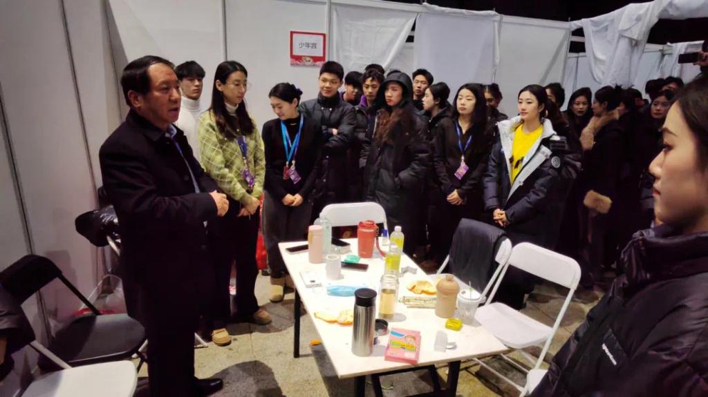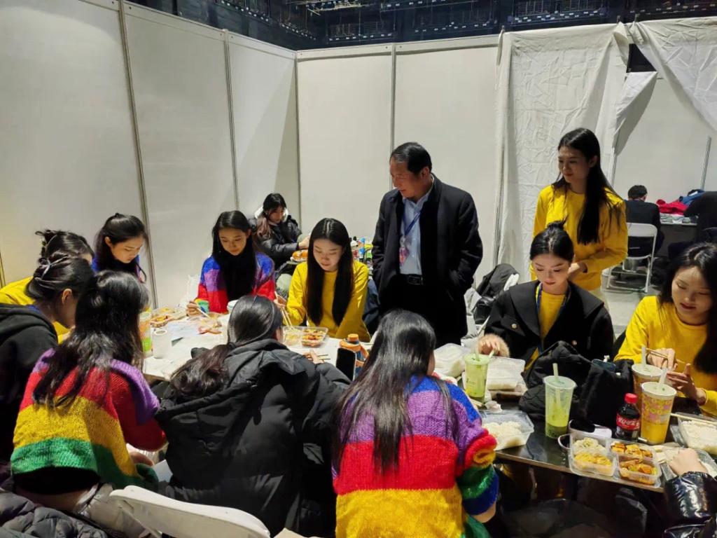 在山青院进行排练时,石硕、顾潇、马体亚、三位老师不辞辛劳,一直陪伴着jdb电子学生进行学习与训练,在北京卫视集中彩排期间,沙雪晗老师全程陪同并带病坚持,为学生保驾护航,树立了爱生如子的感人标杆。jdb电子游戏官方网站党总支书记李永教授专程前往北京看望参演学生,为演出学生加油鼓劲,并代表jdb电子游戏官方网站党委高峰书记为她们送去jdb电子游戏官方网站的温暖慰问和美好祝福,为每一位学生都送上了水果和牛奶,与学子畅聊,鼓励他们坚持不懈,把握珍贵机会,演绎精彩人生,并全程在后台切身感受学生的用餐、排练与现场演出,并与学生合影留念。