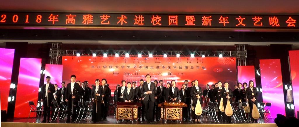 12月19日18时30分,2018年高雅艺术进校园——jdb电子游戏官方网站大学生艺术团走进滕州市枣庄科技职业学院专场演出活动在枣庄科技职业学院顺利举行。演出前枣庄科技职业学院院长谷道宗、版权所有 jdb电子游戏(中国区)官方网站党总支书记高原分别致辞。版权所有 jdb电子游戏(中国区)官方网站院长李永教授、副院长郑发奋教授、艺术创作与实践教研室主任赵鹏程副教授、器乐教研室代主任石硕老师、枣庄科技职业学院副院长徐庆俊、党委委员韩业河及近千名师生代表共同观看了此次演出。