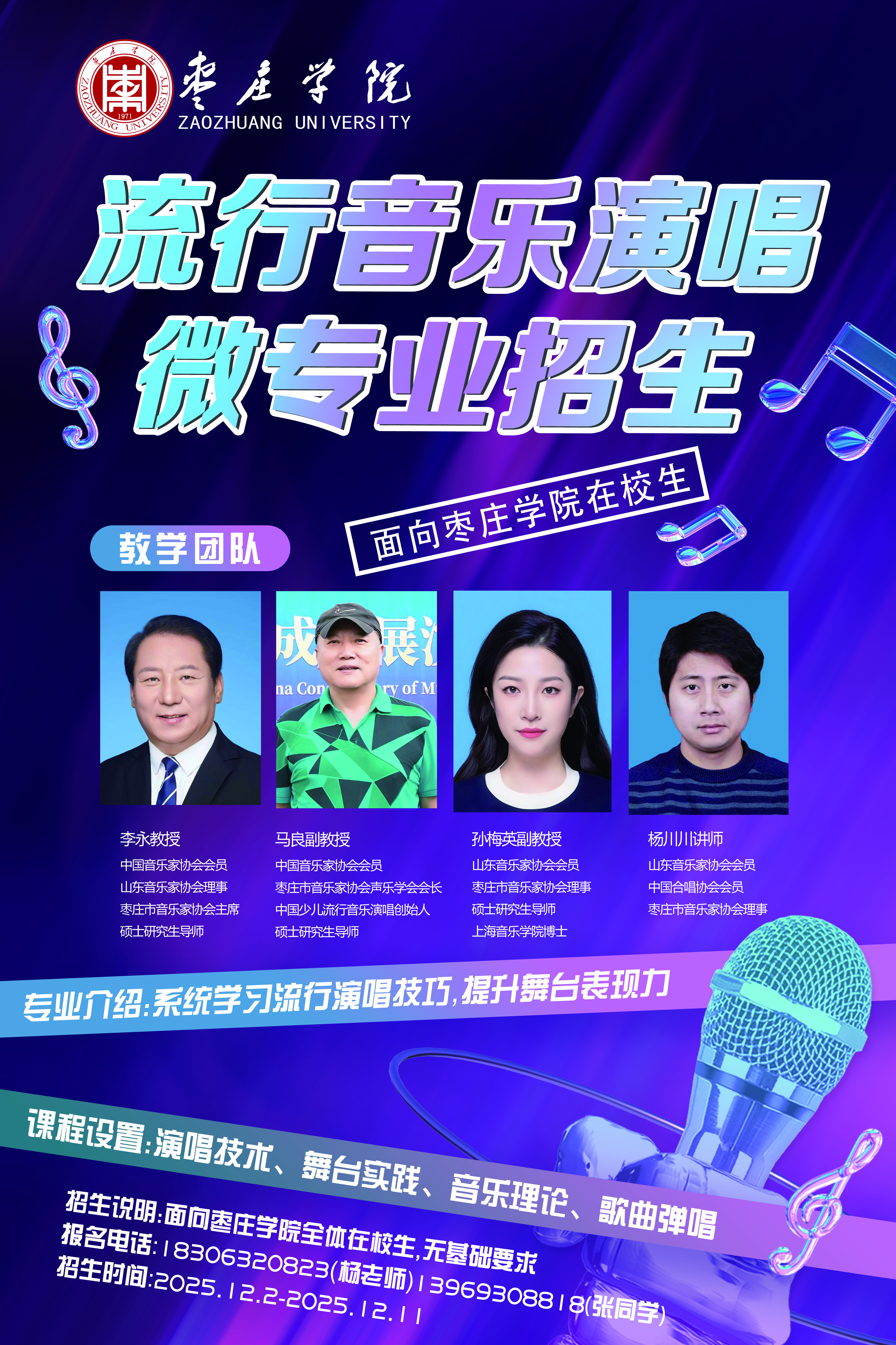 为贯彻新文科建设要求,深化复合型人才培养,版权所有 jdb电子游戏(中国区)官方网站倾力打造流行音乐演唱微专业,2025年招生正式启动!这里集结优质师资、构建系统化课程、提供多元化实践平台,既为你夯实专业基础,更助你绽放音乐魅力,拓宽职业发展新路径。