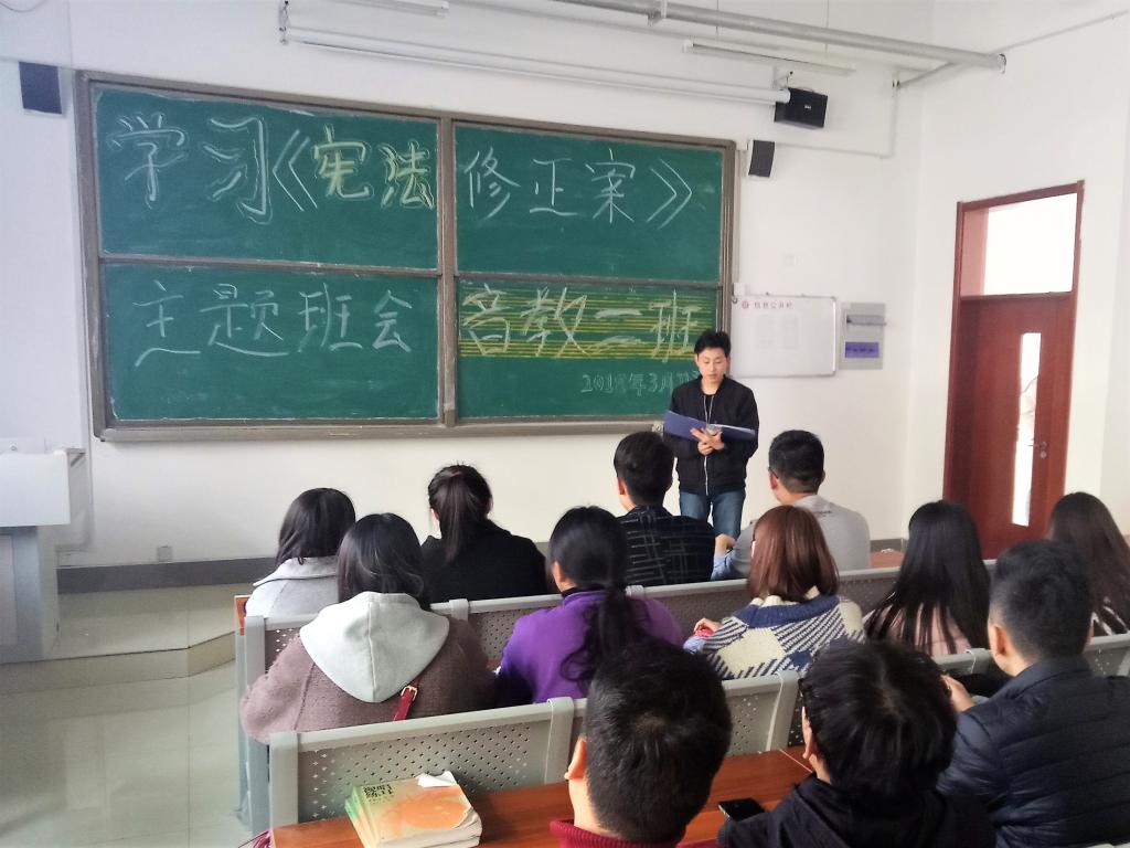 为深入开展宪法教育,大力弘扬宪法精神,切实增强宪法意识,2018年3月21日下午,jdb电子游戏官方网站组织各班级集中开展“学习宪法 尊崇宪法”主题团日活动。