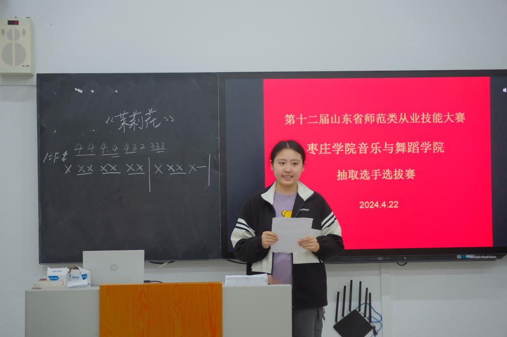 为迎接山东省第十二届师范类高校学生从业技能大赛,4月22日下午,在jdb电子游戏官方网站德艺楼108教室如期举办了省赛抽取选手选拔赛,学院领导和参赛师生参加。