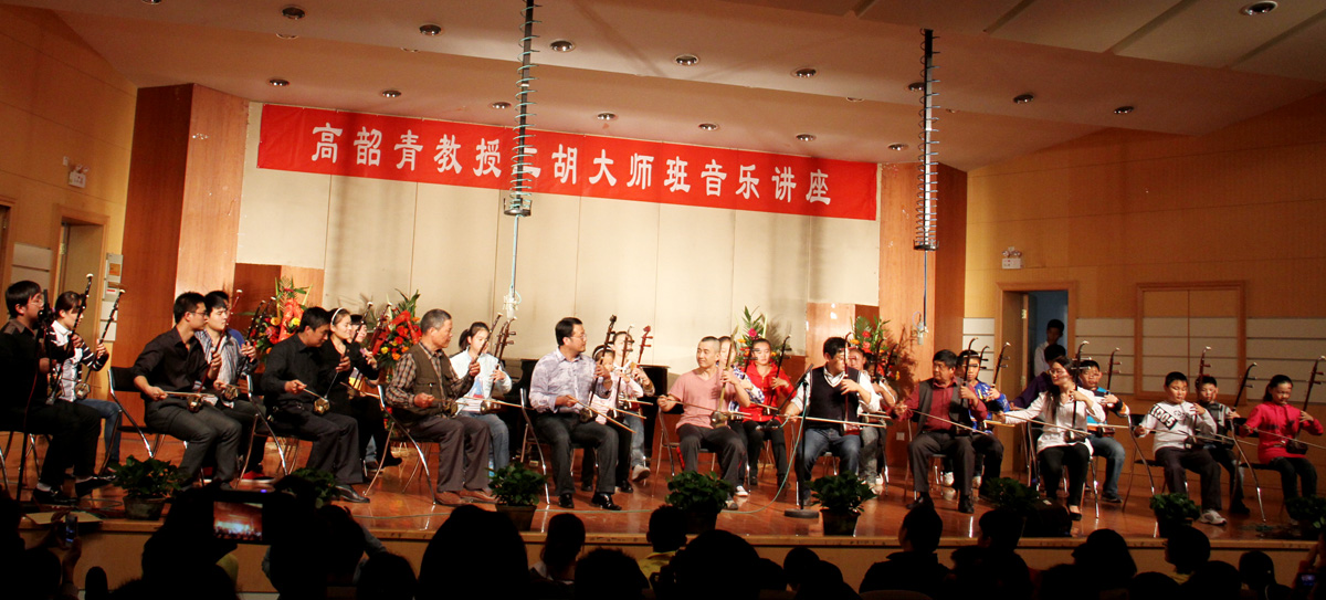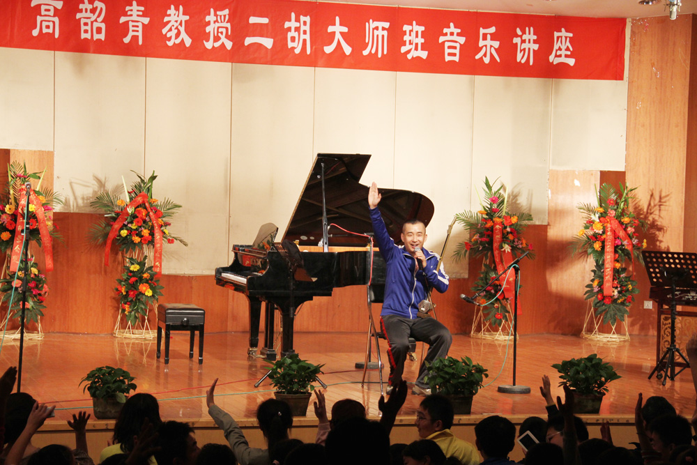在长达四个多小时的讲座和音乐会中,高韶青教授为观众讲解并倾情演奏了8首二胡名曲。高韶青教授的讲座以《秦腔主题随想曲》拉开序幕,并将个人的音乐生涯作为主线,对二胡音乐进行了深入的阐释。音乐会以蒙古风情乐曲《蒙风》拉开帷幕,乐曲以粗犷豪爽的风格,悠长抒情的长调旋律,以及模仿马头琴的演奏手法,生动地描绘了内蒙古那独特的风土人情,极富草原韵味;高韶青教授创作的三首随想曲之《炫动》,运用现代创作技法,并融入了爵士的新元素,使其成为一首节奏丰富多变且富于动力的现代音乐风格二胡作品;最后由高韶青教授与枣庄市二胡学会全体师生共同演奏二胡经典乐曲《北京有个金太阳》、《赛马》,为我们展现了作为民乐至尊的二胡的独特魅力,将本场演奏会带入了另外一个高潮,同时也结束了今天的这道民乐盛宴。