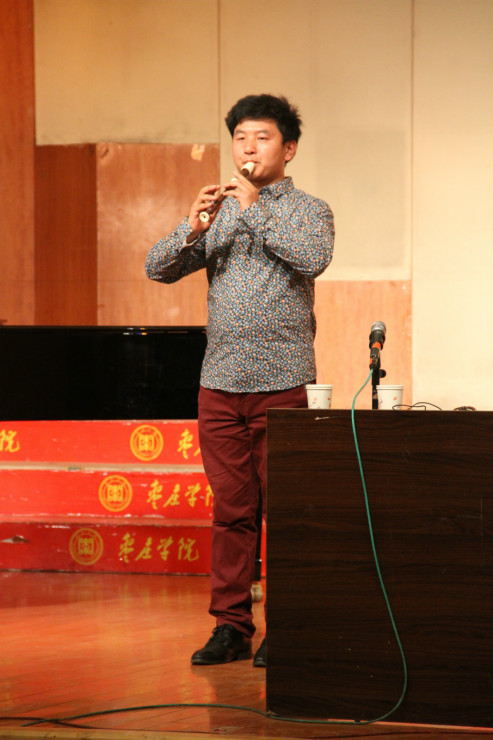郑龙在吹奏竖笛