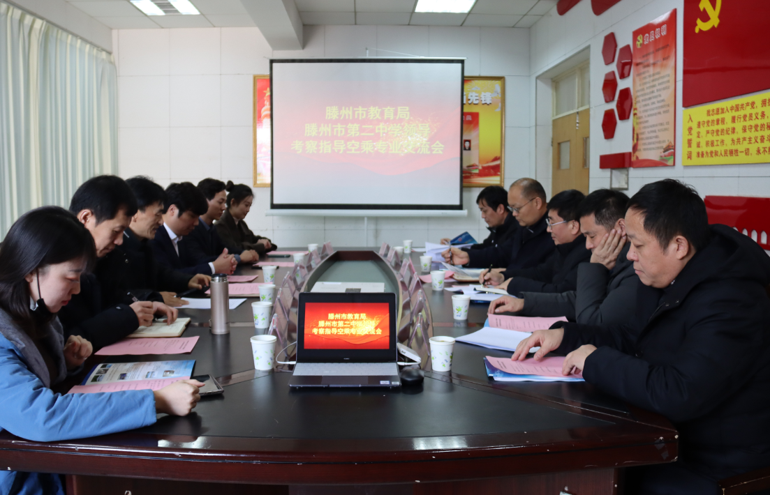 2020年12月22日下午,滕州市教育局、滕州二中领导老师莅临jdb电子考察空乘专业办学情况,山东高翔通用航空股份有限公司负责人,jdb电子党总支书记、空乘专业负责人、空乘班主任陪同,并召开了座谈会。