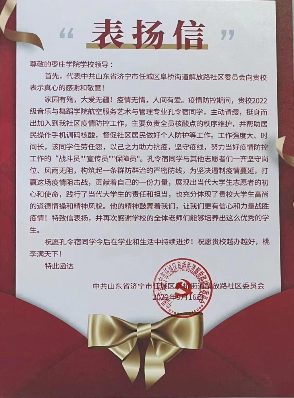 在志愿服务结束后,济宁市任城区阜桥街道解放路社区委员会对jdb电子孔令宿同学勇于担当大学生志愿者的初心和使命,践行当代大学生的责任和担当提出表扬,同时就孔令宿同学的表现向jdb电子游戏官方网站表示感谢。