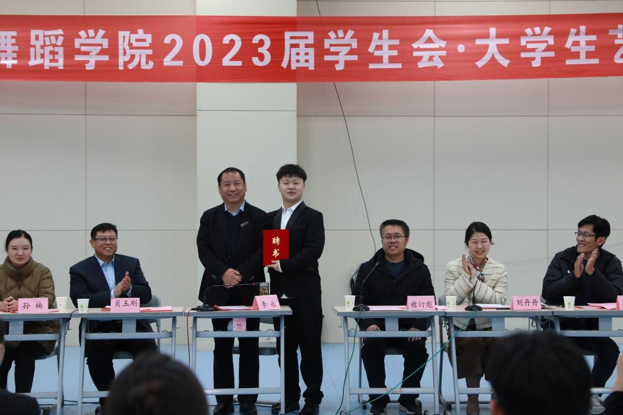 在嘹亮的国歌声中,换届任命大会拉开了序幕,团总支书记刘丹丹郑重宣布了60位学生干部的任命。领导老师为新任学生干部颁发聘书,亲切握手嘱托并合影留念。新任学生会·大学生艺术团主席兼团长朱方晓带领2023届学生干部宣誓,誓言整齐划一、铿锵有力,将任命大会推向高潮。