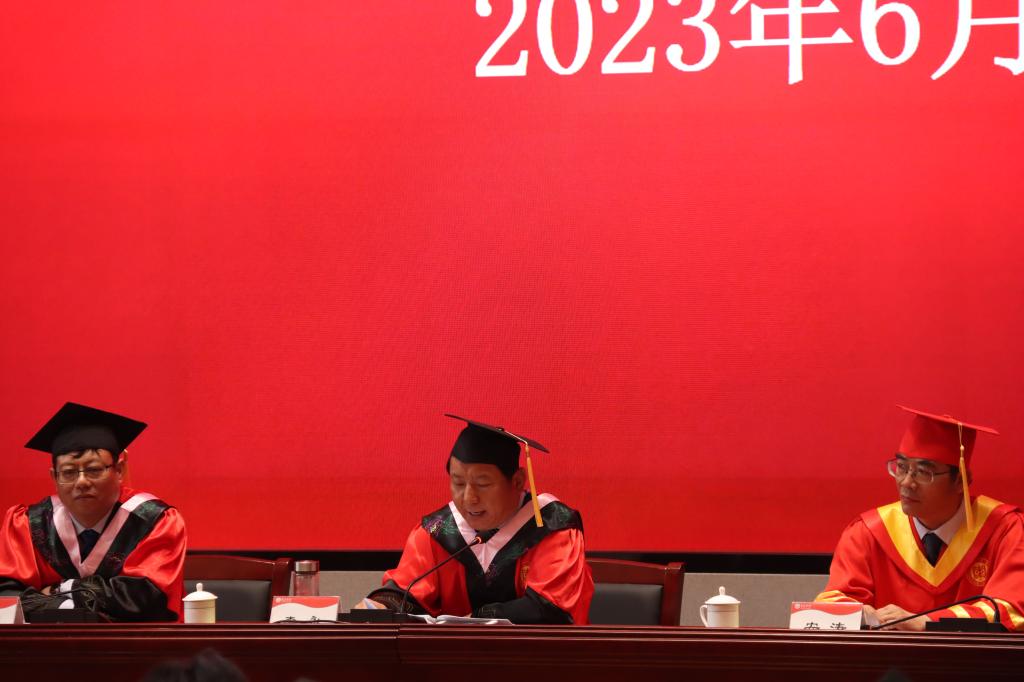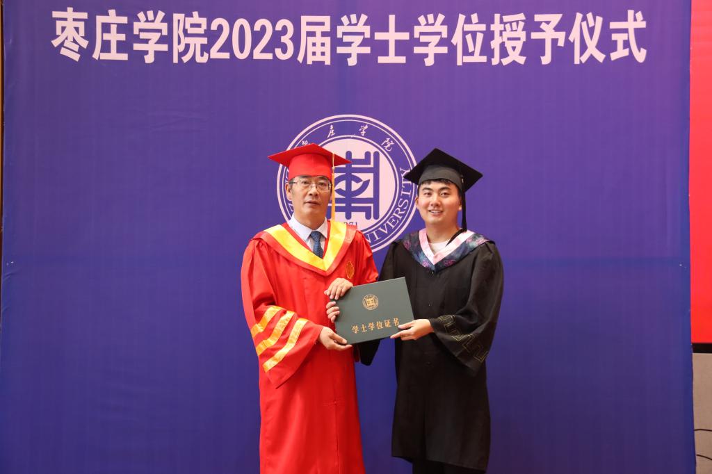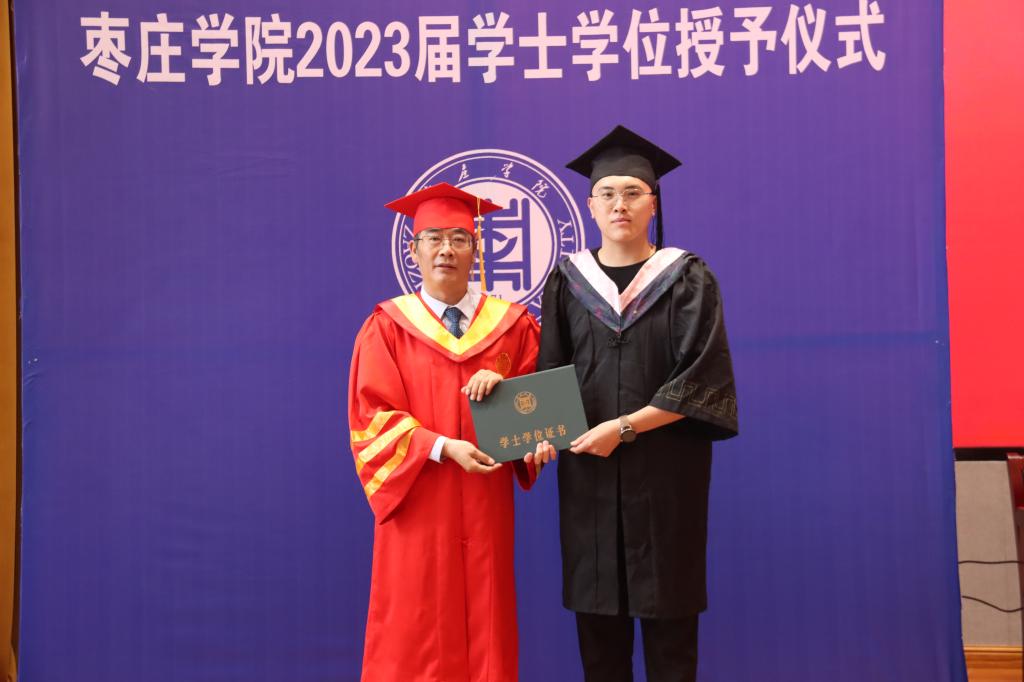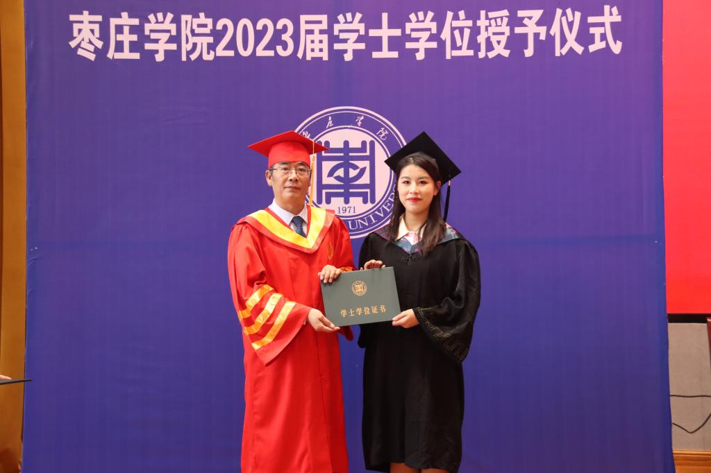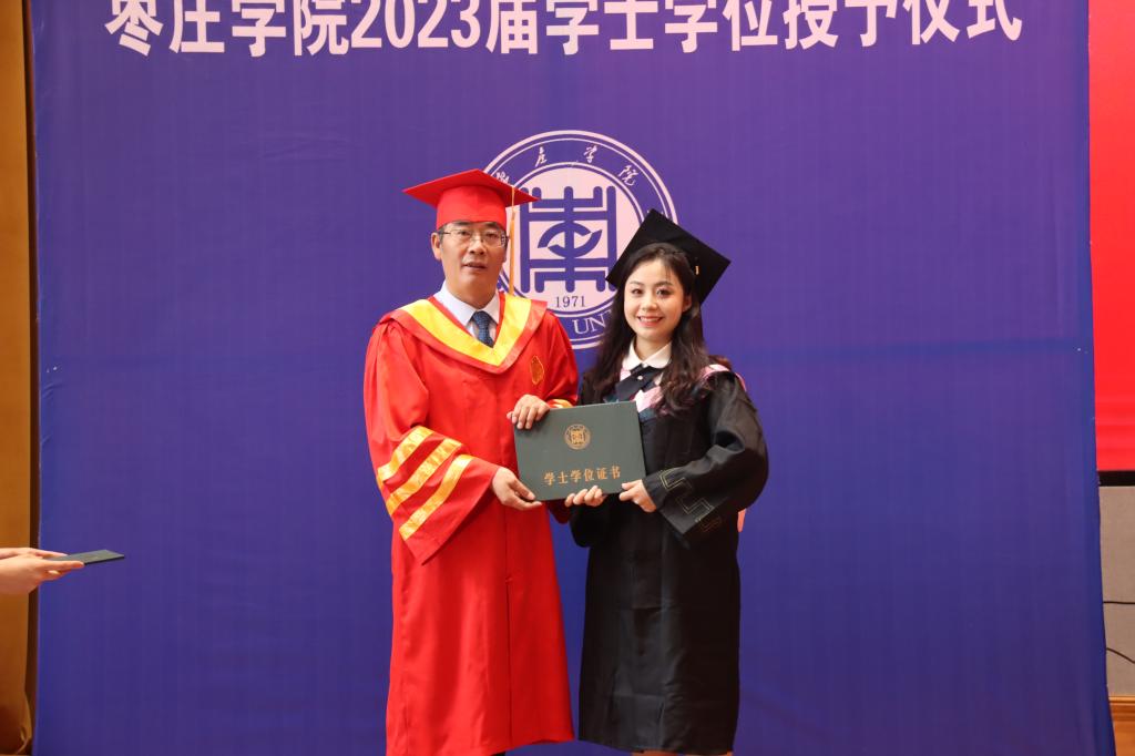 学院党总支副书记褚衍彪宣读《jdb电子游戏官方网站2023届毕业生学士学位授予的决定》及获得学士学位学生名单,毕业生们在欢快的音乐声中走上主席台,副校长安涛依次为他们拨穗正冠、颁发学士学位证书并合影留念。